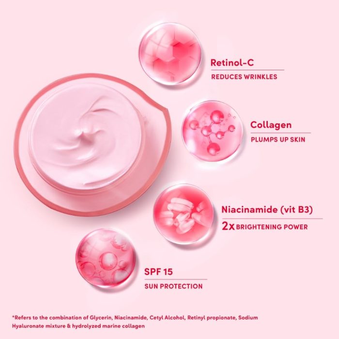 Your skin bears the brunt of being exposed to several harmful external forces: pollution, the sun’s UV rays, everyday stress, and more. All leading to accelerated skin ageing and the loss of collagen. It’s time to fight the signs of ageing with Pond’s Age Miracle Youthful Glow Day Cream. Pond’s Age Miracle Day Cream is an anti-ageing cream created by experts to boost your skin’s radiance and give you that soft, youthful, glowing skin in 7 days. It is the perfect combination of potent ingredients, including 10% Retinol-Collagen B3 Complex and SPF. The retinoids released from the Retinol-C Complex effectively reduce fine lines and enhance skin elasticity. Additionally, collagen keeps your skin plump and younger-looking. This day cream with SPF 15 PA++ also gives you complete protection from UVA and UVB rays and sun damage. It contains Vitamin B3’s restorative properties as well, which fade dark spots and hyperpigmentation with 2x skin brightening power. Suitable for all skin types, Pond’s Age Miracle Youthful Glow Day Cream with SPF repairs and prevents skin damage and combats early signs of ageing. So start young, stay young! Pair it with Pond’s Age Miracle Youthful Glow Night Cream, and you have a complete anti-ageing skincare routine. |