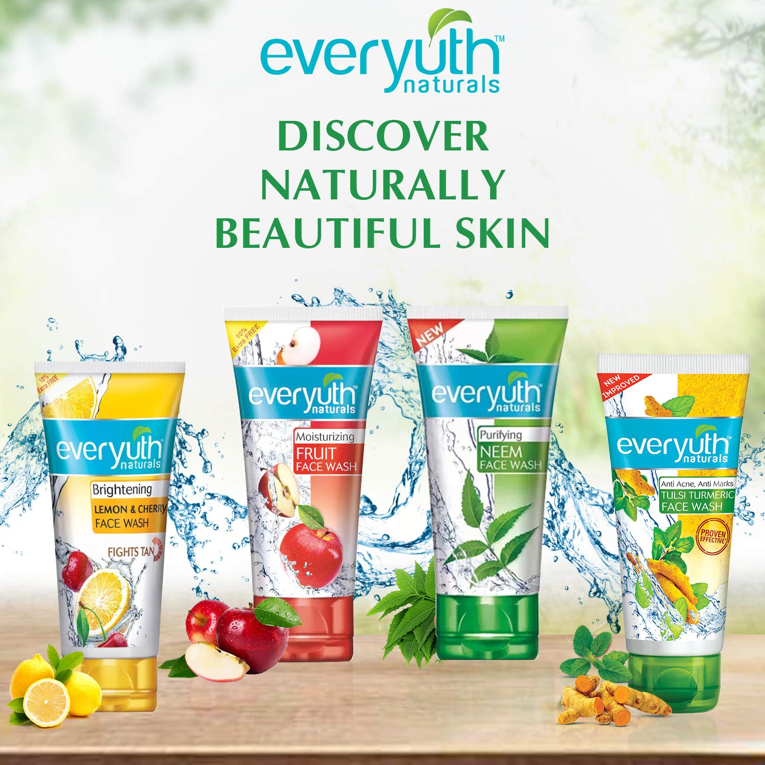 - 100% SOAP FREE FACE WASH New EverYuth Naturals Brightening Lemon & Cherry Face Wash brings together the Vitamin C rich lemon and brightening cherry extracts. It washes away excess oil without making it too dry. Skin looks brighter. Regular usage helps in fighting tan too. SUITABLE FOR ALL SKIN TYPES. Directions for use: Squeeze out a small quantity onto your palm. Work up lather and gently massage on your face. Rinse with water and pat dry. For best results, use two or three times a day.