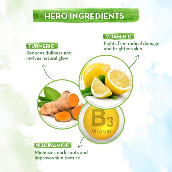- REVIVES NATURAL GLOW: Get your glow on! Packed with Turmeric’s anti-inflammatory benefits, the Vitamin C Daily Glow Face Serum reduces dullness & unlocks natural glow.